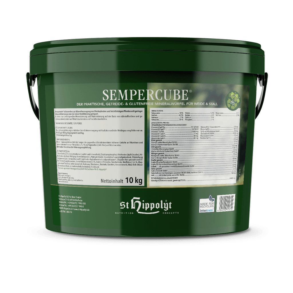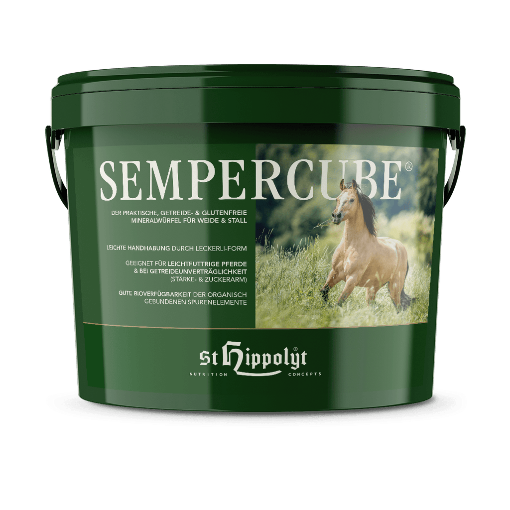 Sempercube® ist besonders zur Mineralversorgung von Weidepferden und leichtfuttrigen Pferden mit geringer Krippenfuttermenge oder bei reiner Heufütterung geeignet.