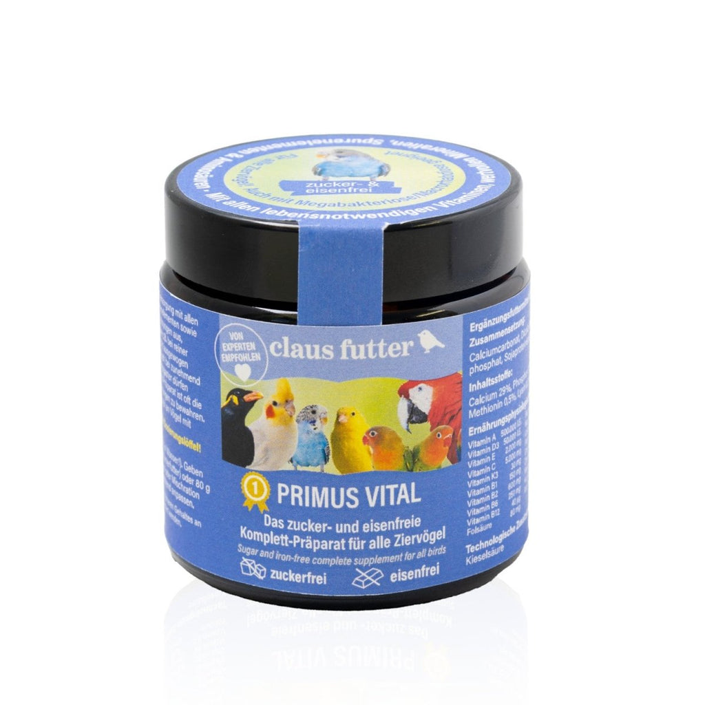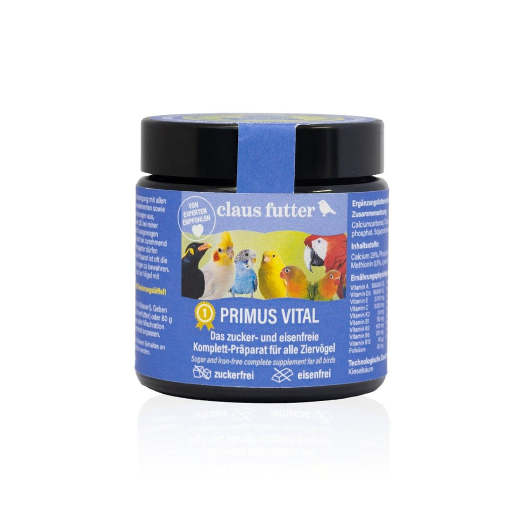 Von Tierärzten und Vogelhaltern wird seit langem ein zuckerfreies Vitaminpräparat für Vögel nachgefragt. Herkömmliche Präparate enthalten in der Regel Zucker. In Zusammenarbeit mit Vogelexperten und Biologen haben wir nun mit PRIMUS VITAL ein zuckerfreies Ergänzungsfuttermittel entwickelt. Es bietet eine Komplettversorgung mit lebensnotwendigen Vitaminen, Mineralien & Spurenelementen sowie ein breites Spektrum an Aminosäuren. Es gleicht so Mangelerscheinungen aus, die durch einseitige Ernährung entstehen können, wie z.B. bei reiner Körnerfütterung. Hier ist die Nährstoffver-sorgung nicht ausgewogen und zwingend ein Ergänzungspräparat notwen-dig. PRIMUS VITAL unterstützt auch eine erfolgreiche Aufzucht von Jungvögeln. Bei der zunehmend vorkommenden Megabakteriose/Macrorhabdiose, dürfen Vögel keinen Zucker zu sich nehmen. Ein zuckerfreies Präparat ist oft die einzige Möglichkeit, solche Tiere vor Mangelerscheinungen zu bewahren. PRIMUS VITAL ist zudem eisenfrei und kann von Vögeln mit Eisenspeicherkrankheit aufgenommen werden. Es ergänzt optimal unser vielfältiges Sortiment für Ziervögel wie z.B. PRIMUS BASIS und PRIMUS AUFZUCHT für Wellensittiche, die Claus Weichfutter sowie HARI Premium-Papageienfutter. Umweltfreundlich verpackt im hochwertigen abgetönten Glastiegel, damit die Vitamine erhalten bleiben! Messlöffel zur Dosierung in der Packung enthalten!