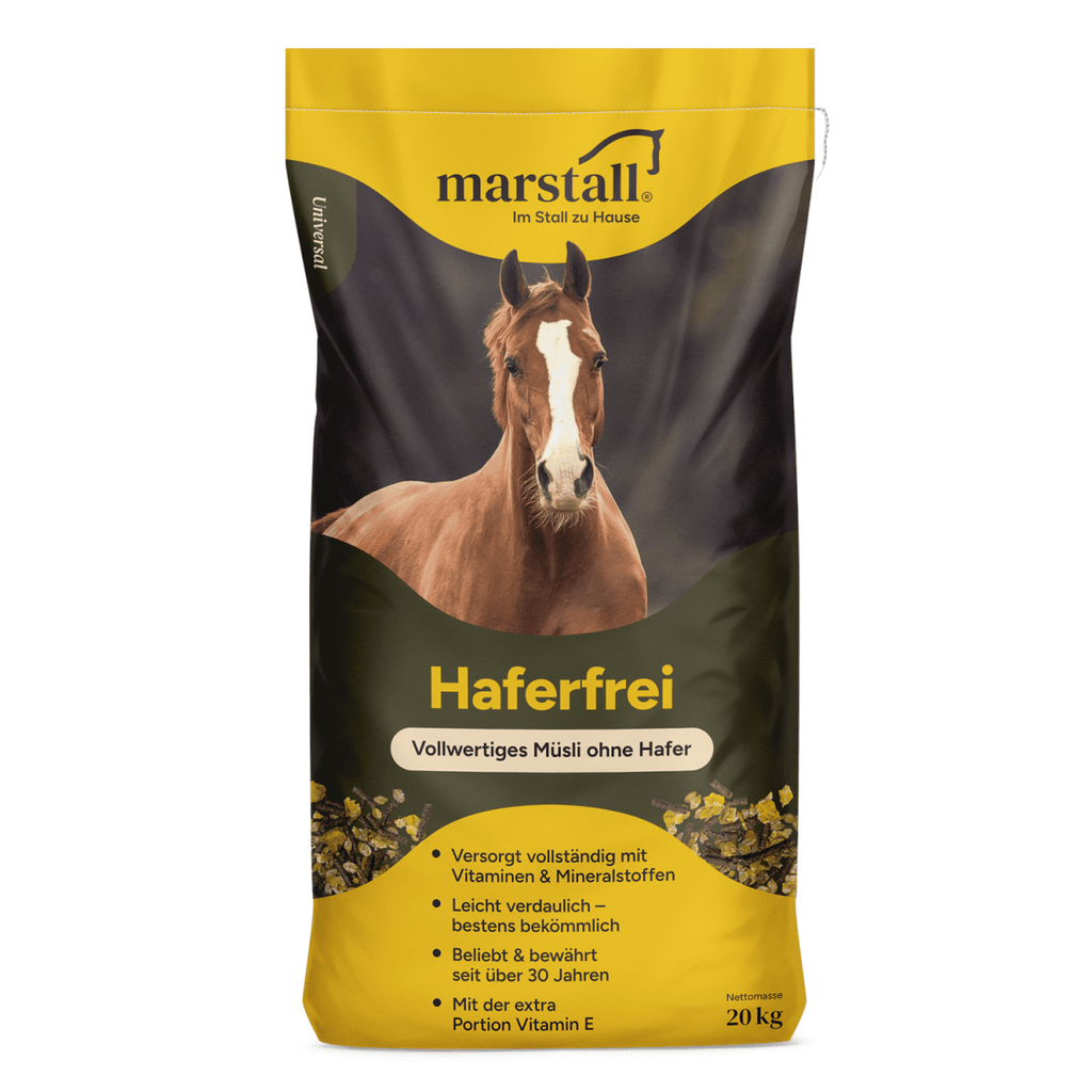 marstall Haferfrei ist marstalls bekanntestes und beliebtestes Müsli ohne Hafer. Es bildet seit Pferdegenerationen die Basis der täglichen Fütterung. Viele Kunden bestätigen durch ihre langjährige Treue und Zufriedenheit die Qualität der stetig verfeinerten Original-Rezeptur. marstall Haferfrei eignet sich als alleiniges Müsli und zur Kombination mit Getreide. Da Getreide ein sehr enges Ca:P-Verhältnis aufweist, ist marstall Haferfrei mit einem speziell weit ausgelegten Ca:P-Verhältnis von 3:1 das ideale Kombinationsfuttermittel. Durch die doppelte Mineralisierung und Vitaminierung ist marstall Haferfrei außerdem bestens für die 1:1-Mischung mit betriebseigenem Hafer, Pellets oder anderen Getreide- und Müsli-Sorten geeignet. So kann eine für den Betrieb und das einzelne Pferd individuelle Kraftfuttervariante zusammengestellt werden – je nach Leistungsanspruch.
